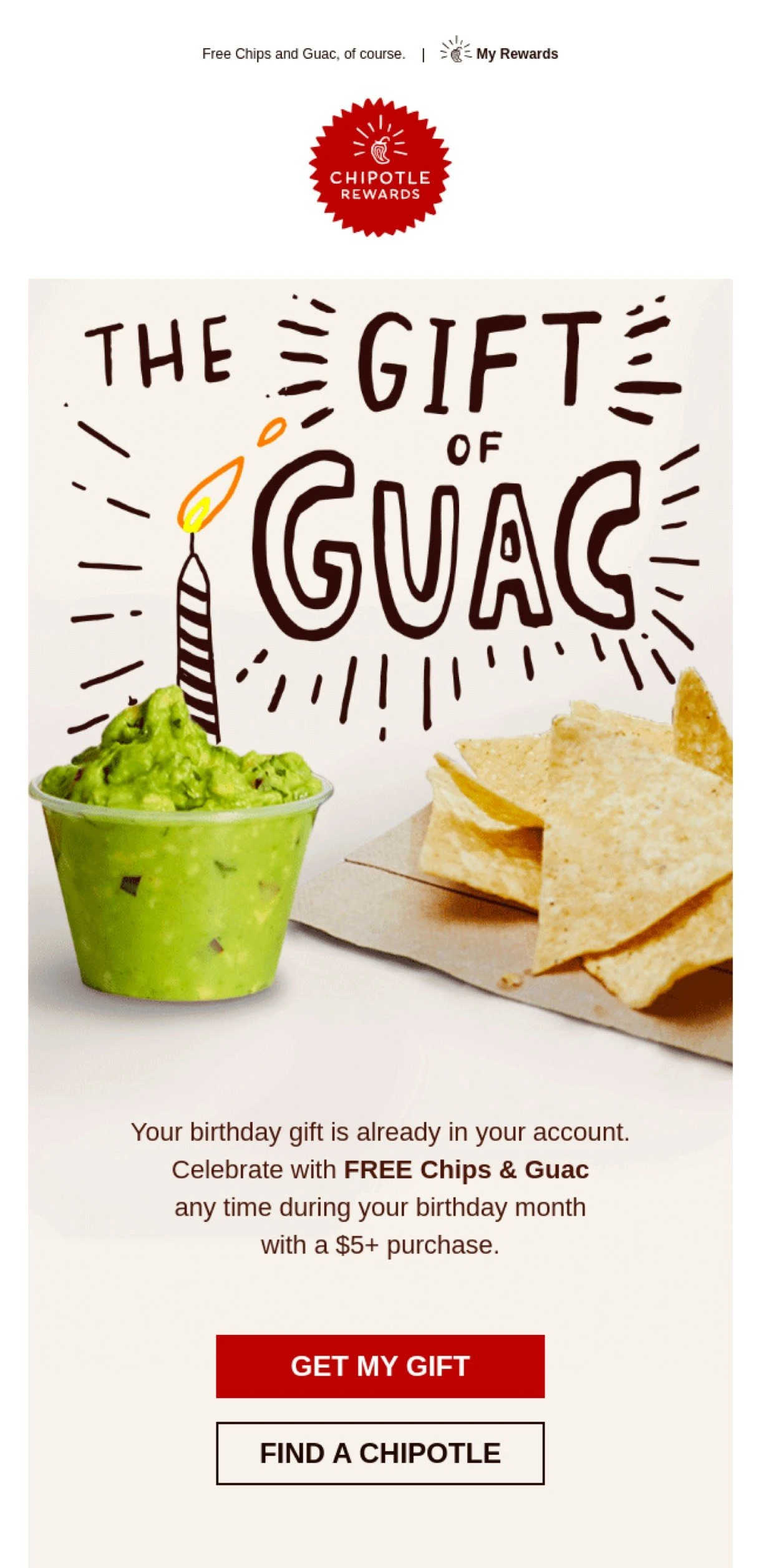Is there something small you can surprise readers with? It might be a free gift that comes with their next online order or a surprise that can be picked up in-store. You can either tell subscribers what to expect (like Chipotle below) or keep it mysterious so that readers need to head over to your online or physical shop to find out.