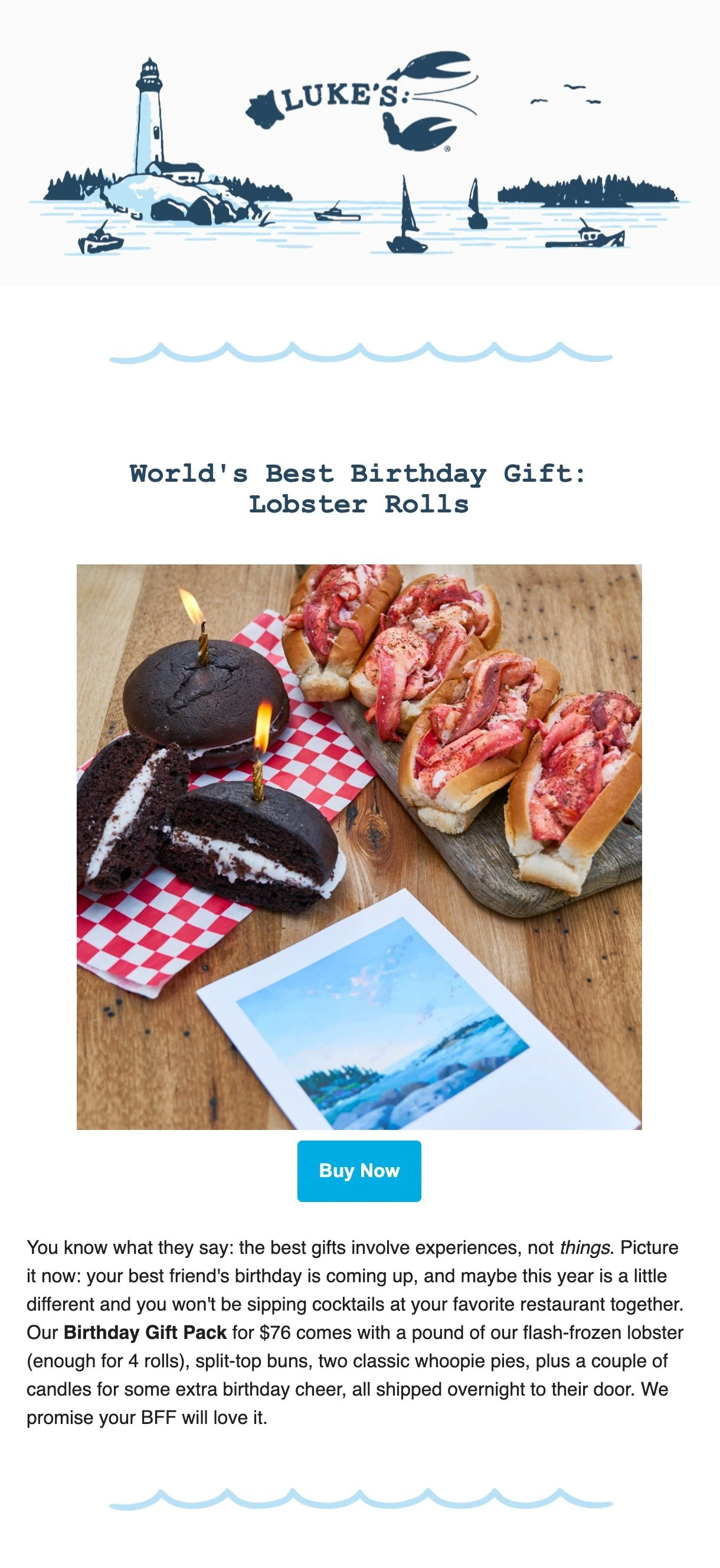 By sending an out of the box email like the one below, Luke’s Lobster does 3 things: They put a creative twist on birthday email campaigns, they found a way to generate new sales during the pandemic and they introduce readers to their new concept using a fun narrative.