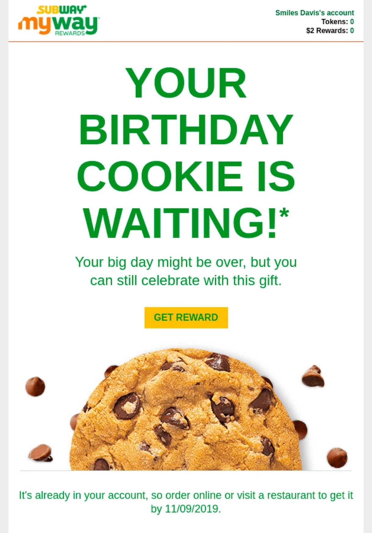 The email below from Subway puts a fun spin on a birthday reminder email. The email subject line reads: “Hurry, your birthday cookie is going to crumble soon…”