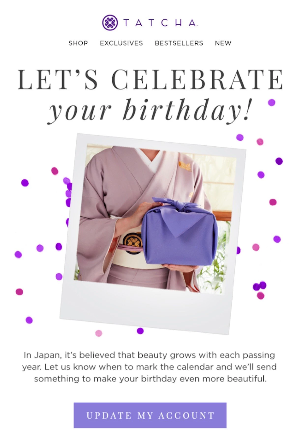 Below you see an example of how e-commerce store Tatcha asks subscribers to add their birthday by updating their account.