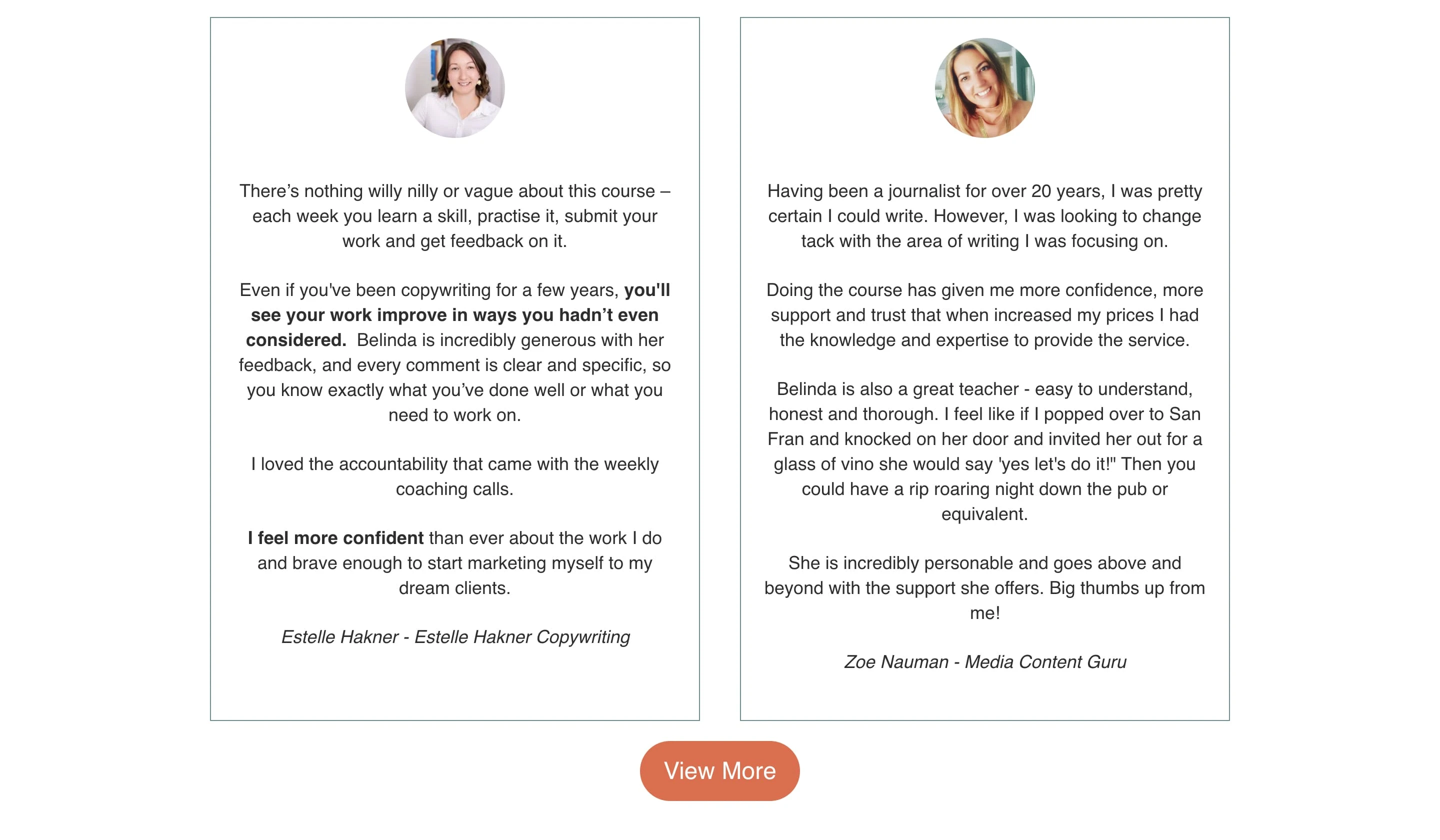 On her copywriting course landing page, Belinda Weaver includes lots of testimonials to help encourage readers towards making the purchase.