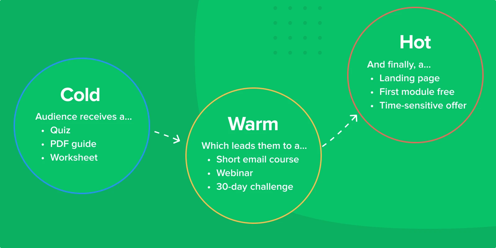Think about what steps your customers will take before they sign up for your course. In fancy terms this is called a “sales funnel”, but this just means that there are phases to how you’ll catch their interest and guide them towards buying the course.