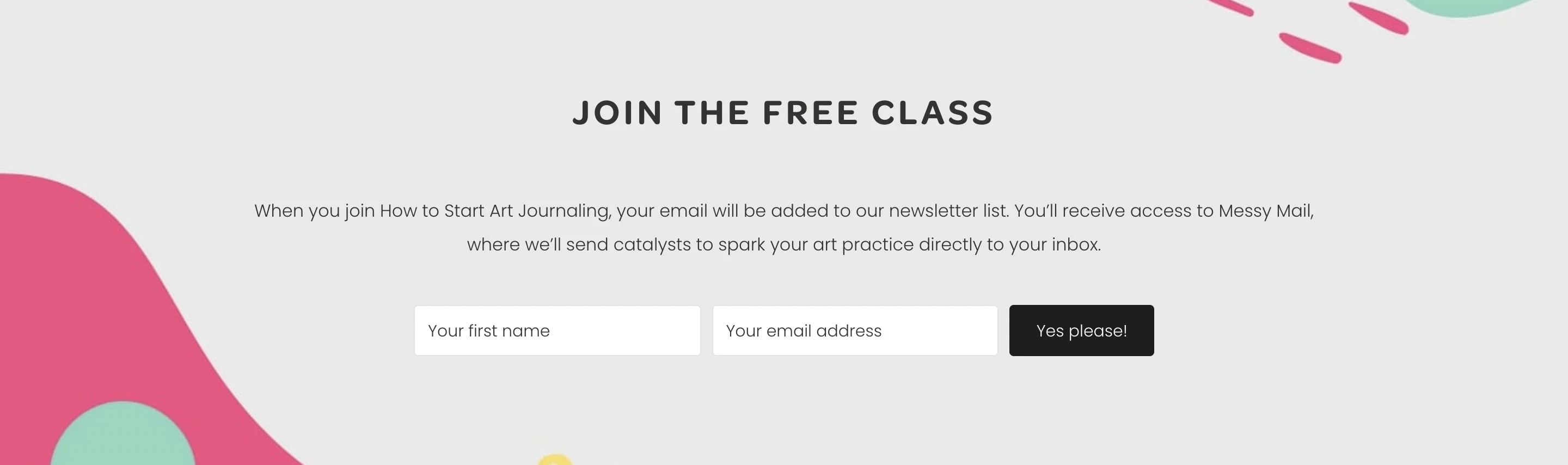 Get Messy promotes their art journaling course by sharing a free class with people who sign up. This will grow their audience and allow them to upsell and promote future products.
