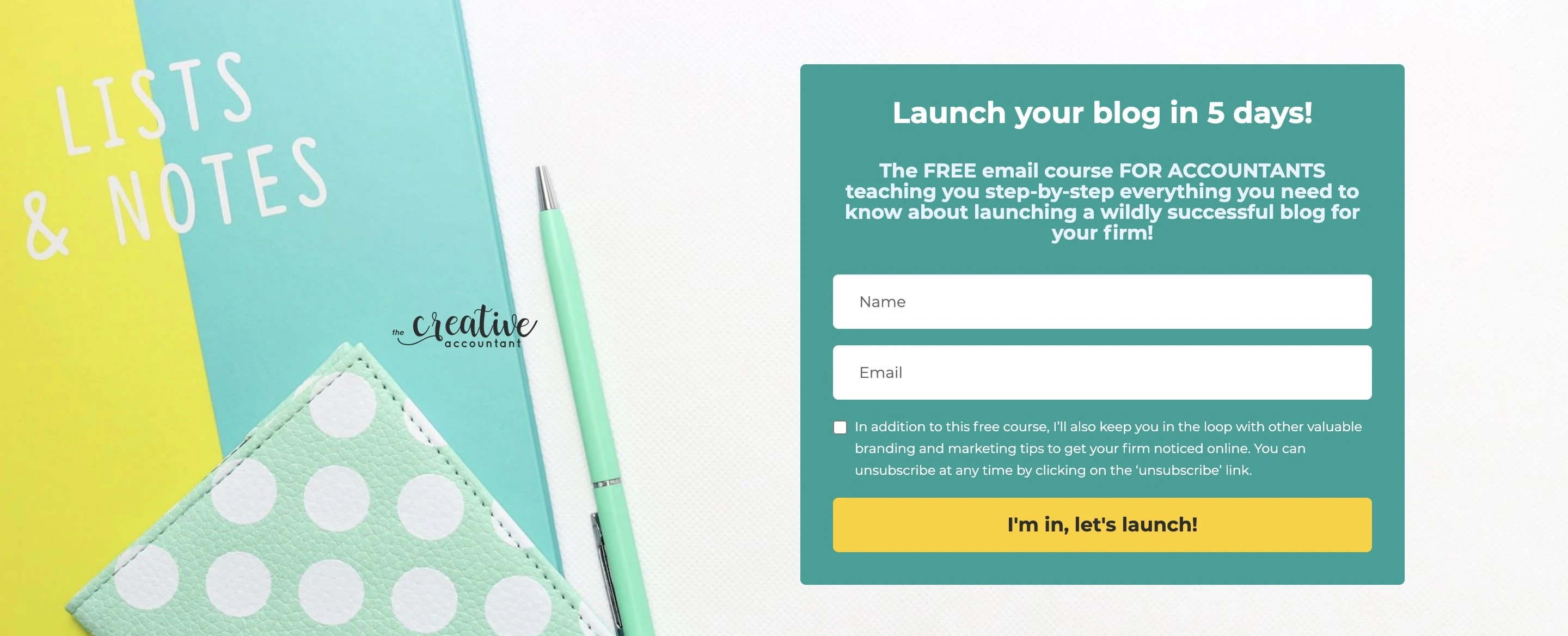 Remember that sales funnel? Your course sales page is where you’ll explain the benefits to your audience so they’ll take action—just like this landing page by The Creative Accountant for their free email course.