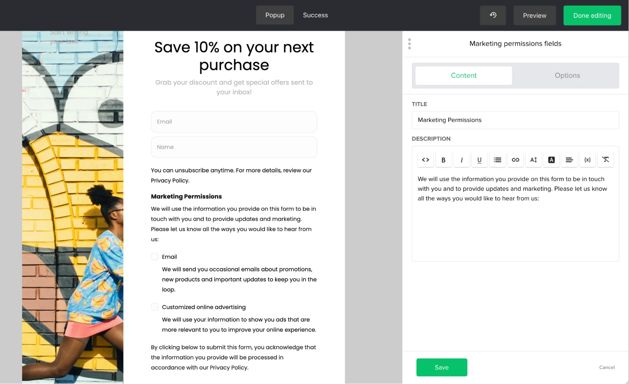 See an example in the image below. You can edit the content and add or remove checkboxes to make the opt-in relevant to your needs.