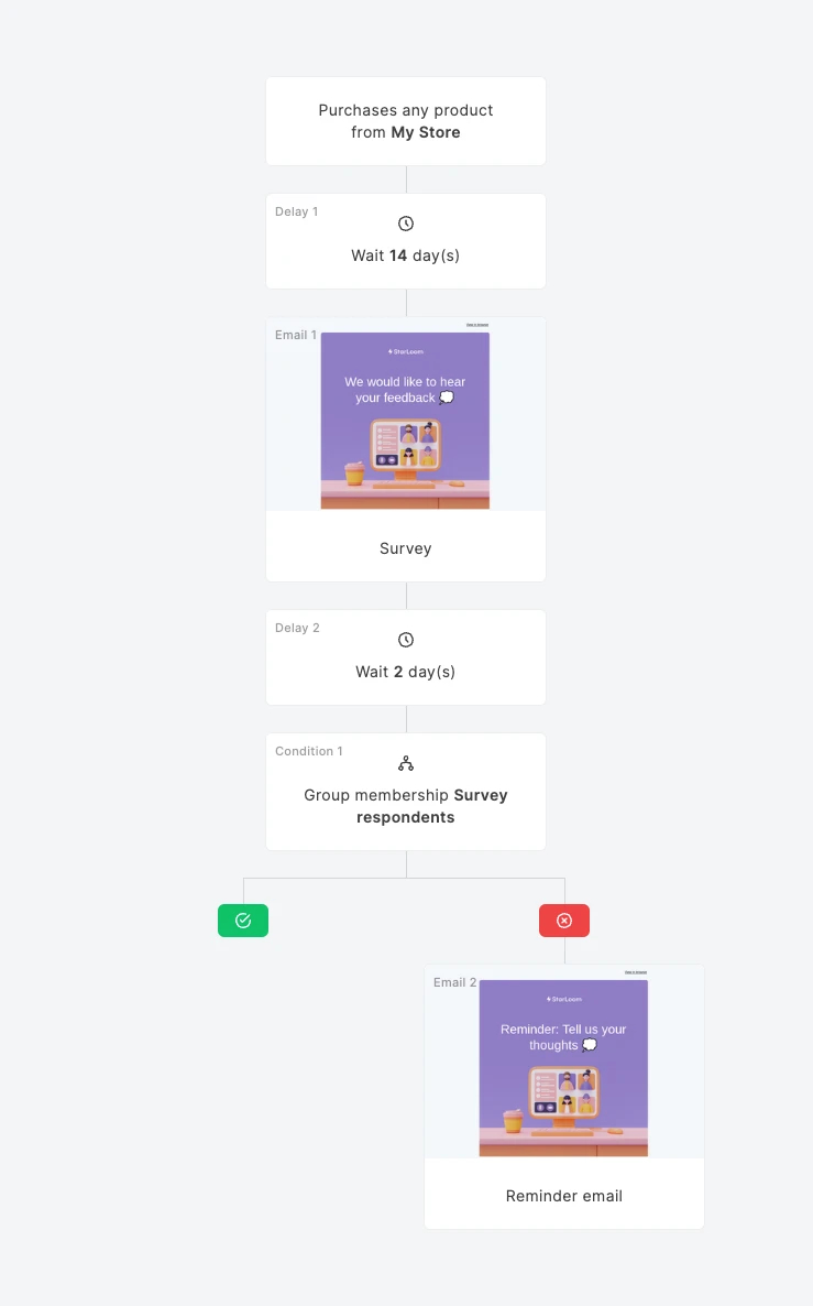 Imagine you send your initial survey a week after someone buys from your store. You could then automate follow-ups depending on how people interact with this content.