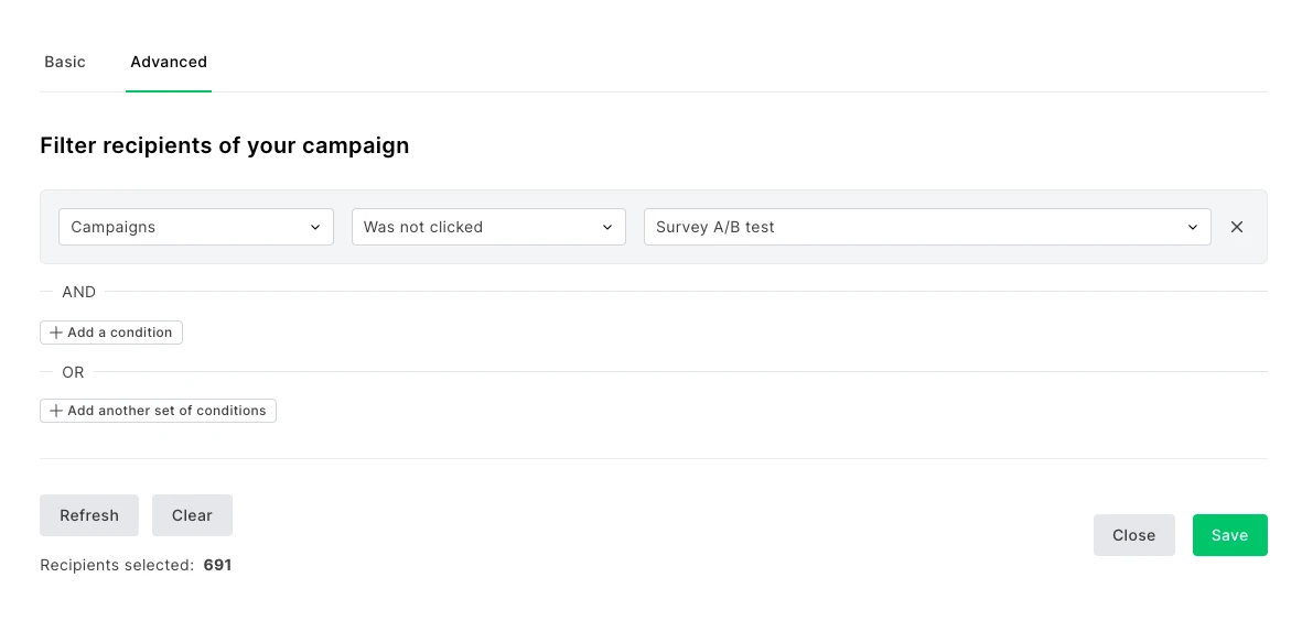 Alternatively, if you want to send to people who didn’t open or click on the initial email, follow the steps above but choose the condition Campaigns, Was not clicked, and then choose the initial survey email.
