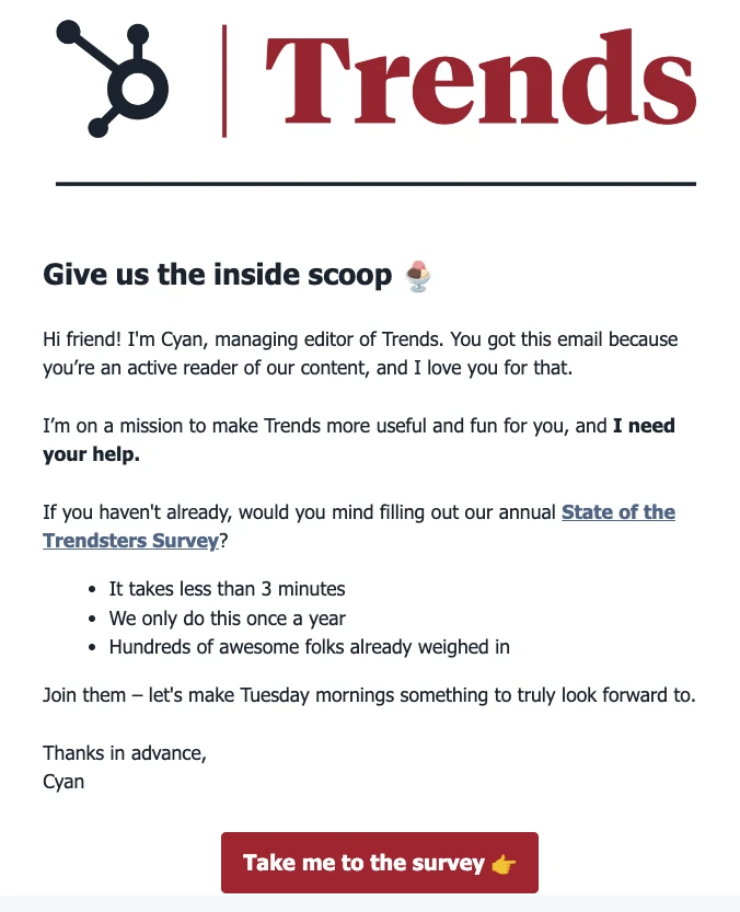 Use the content to highlight why the person is receiving the email and why you are running the survey. Also reaffirm what’s in it for the subscriber, whether that’s a discount, incentive, or the chance to shape the future of your product.