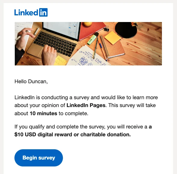 In the example below, LinkedIn offers everyone who takes the survey a $10 gift card, a very appealing incentive.