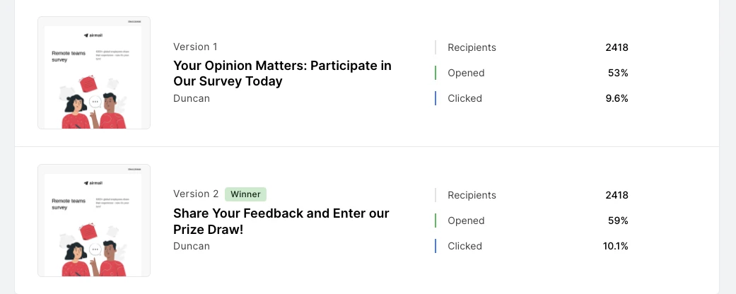 In the case of survey response emails, you’d want to test to see which resulted in the most clicks on your survey link.