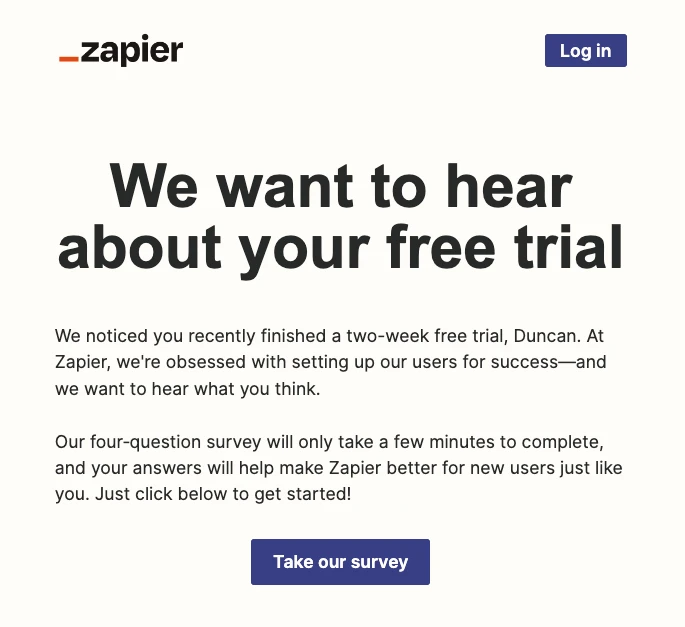 In the email below, Zapier explains that the survey will help make the tool better for new users. If that’s something the recipient wants to help with, they know that completing the survey will make an impact.