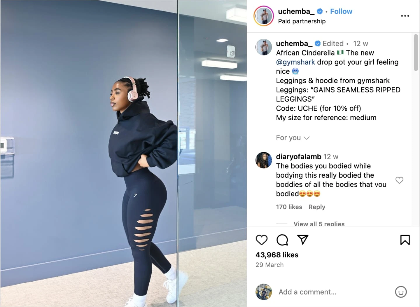 See the example of @uchemba_ below promoting Gymshark leggings and a hoodie. She also sweetens the deal with an exclusive 10% discount code.