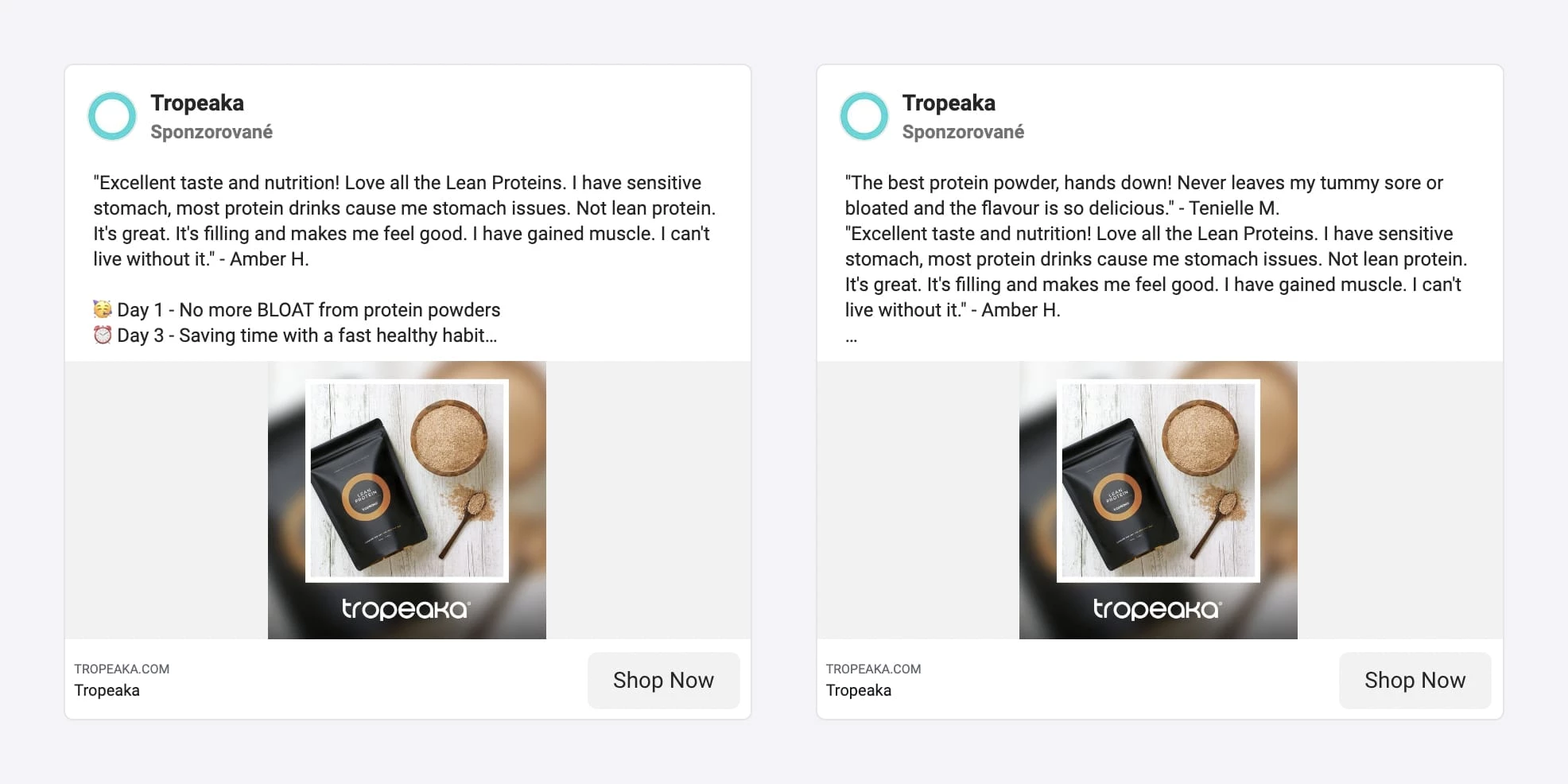Here are two Facebook Ad variations from Tropeaka using Shopify as their selling platform. These two different ads focus on specific products allowing the brand to test out which ad is more effective based on the product offering and messaging [i.e. ad text].