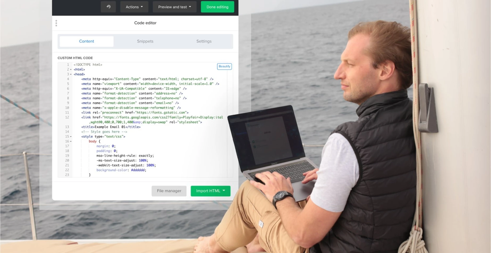 Base snippets: Newsletter coding is slightly different from coding a website. There are certain rules. A base snippet is a good starting point for your custom HTML email, as it has all the required elements and structure to help you create a fully functional (and good-looking!) email. If you already know some HTML code, you can simply start creating your email from the Base snippet, and continue your creations from there.