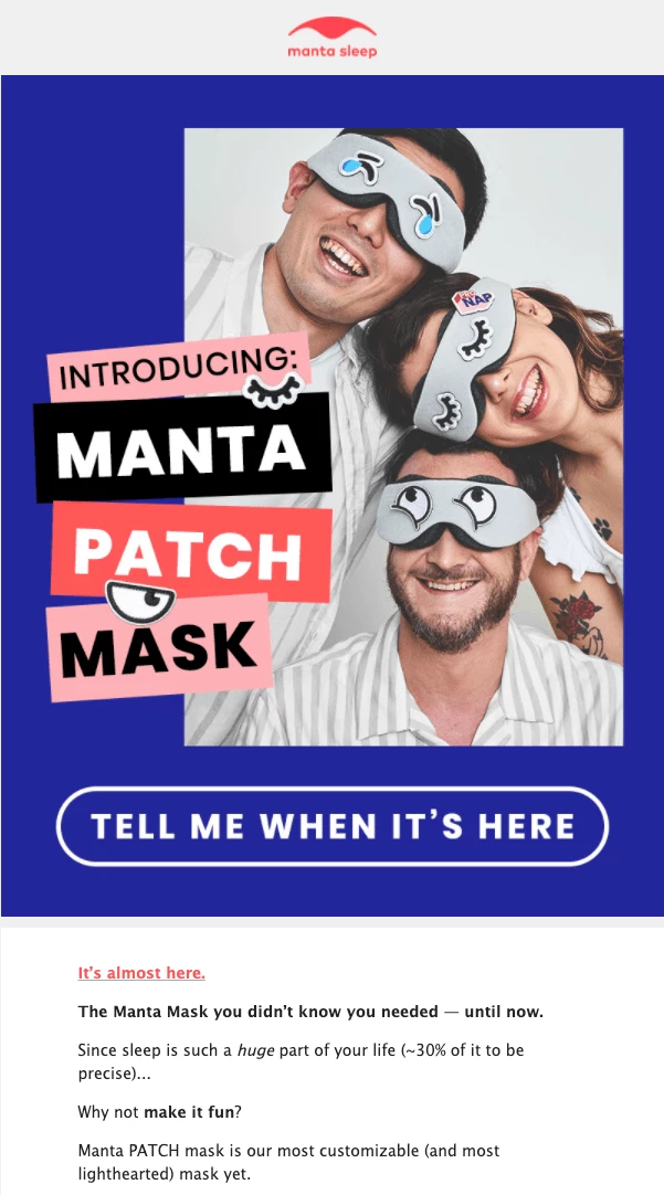 In this newsletter image from Manta Sleep, the reader immediately sees what their new range of sleep masks will look like (featuring fun patches that can be stuck anywhere on the mask)!