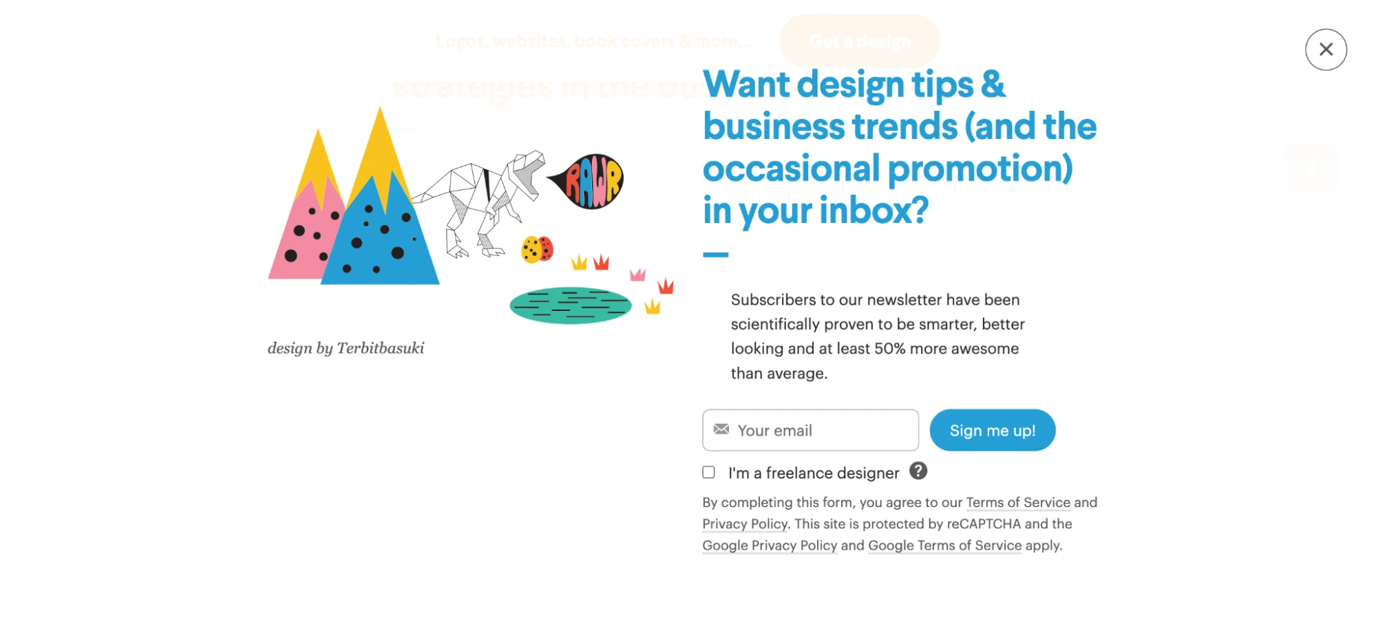 99Designs uses a welcome mat pop-up that's impossible to miss but has a clear close button so people can easily get back to the content.