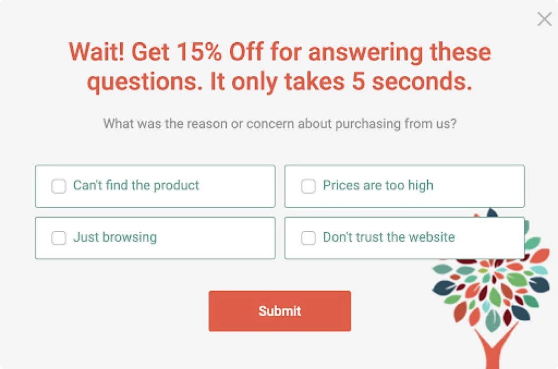 Since people can answer the question without leaving the webpage, they’re more likely to reply. Plus, the brand offers an extra 15% off to anyone who completes the survey.