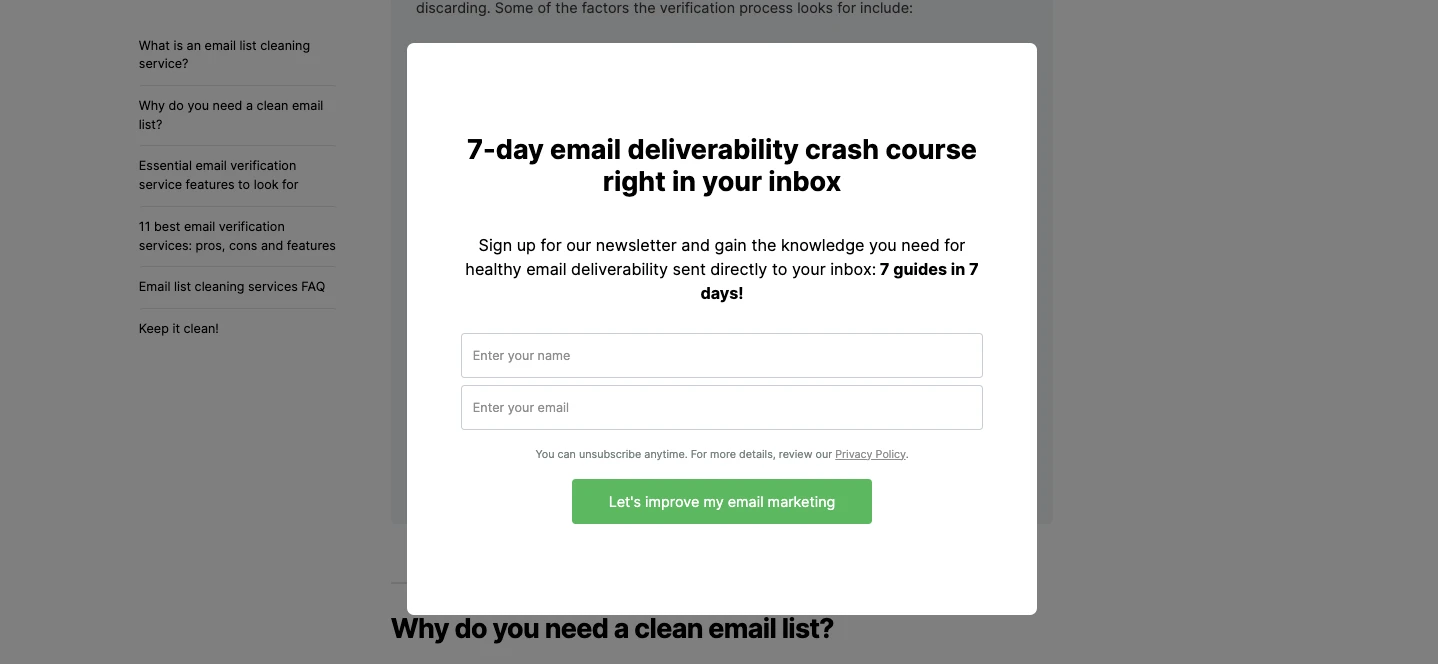 At MailerLite, we promote our downloadable email deliverability crash course with a timed pop-up on our blog post about the best email list cleaning services.