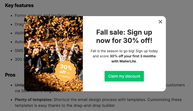 Consider using your pop-up to send people straight to a page on your website rather than using it to generate email signups. You can easily do this in MailerLite by creating a promotion pop-up.