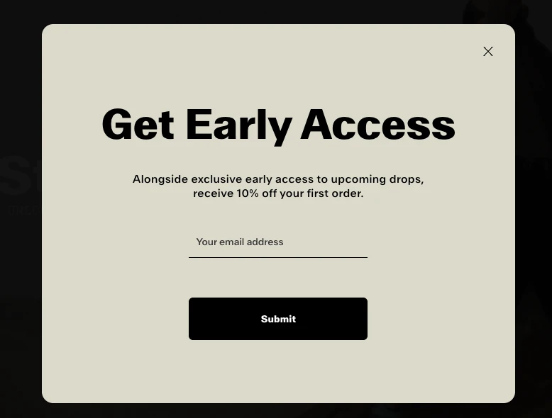 This pop-up from Satisfy Running promises subscribers early access to new drops and a discount. The clear call-to-action (CTA) is prominent and the value is clear. Plus the simple color scheme with lots of contrast is super easy to read.