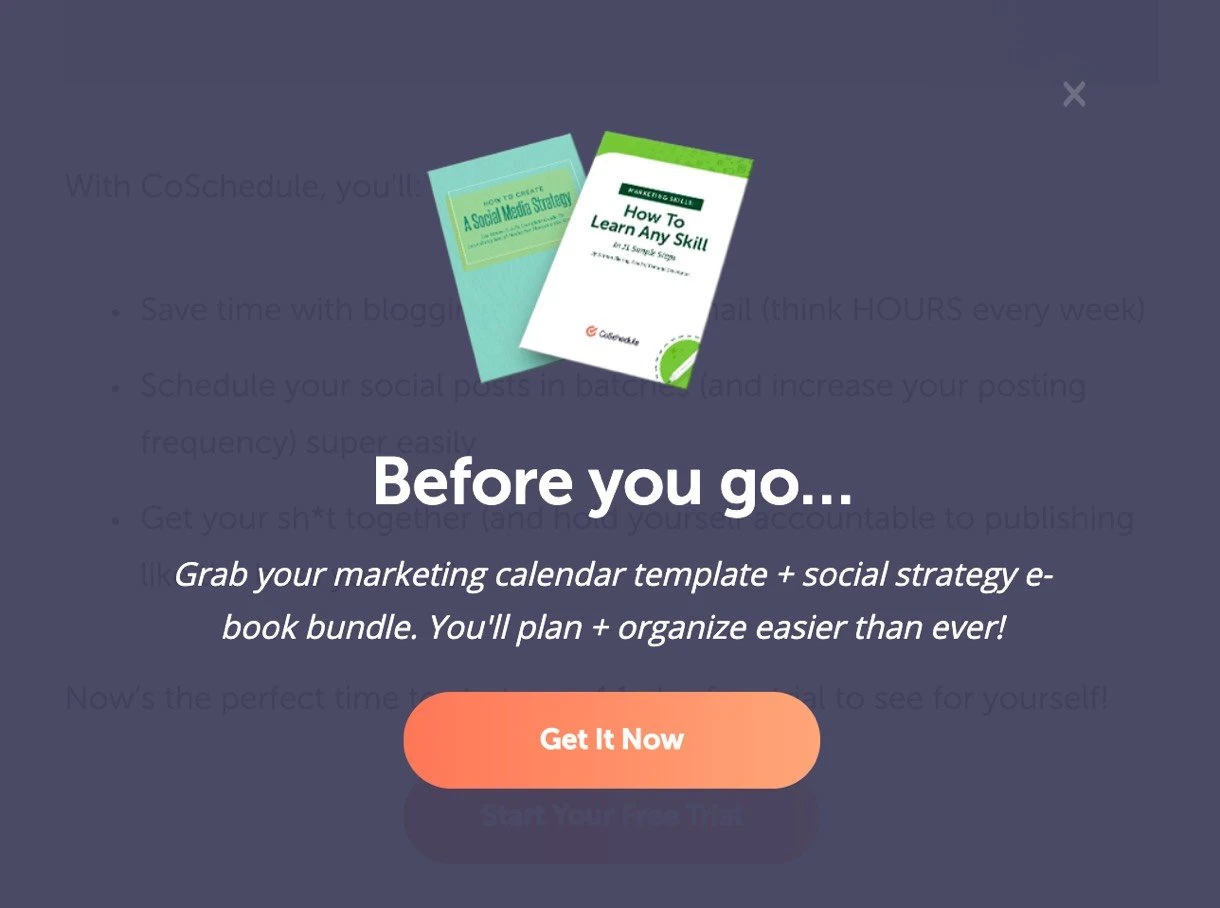 The team at Coschedule uses exit intent pop-ups to reach out to visitors one last time before they leave. The freebie offer may be all the website visitors need to keep engaging with the brand.