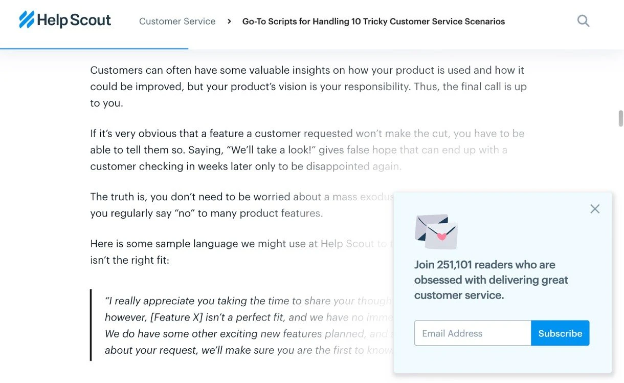 Here's a great example of a scroll-triggered pop-up on the Help Scout blog. It uses a simple newsletter signup CTA, which may work since readers who have scrolled to this point have shown they enjoy the brand’s content.