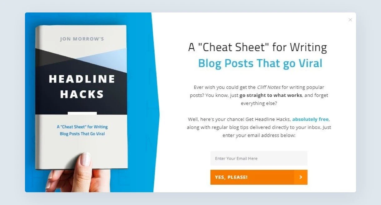 Cheat sheet pop-ups promote a resource that can help readers achieve a specific goal. Here's an example from SmartBlogger. The offer of a guide to help your content go viral is sure to appeal to the brand’s readers who are typically looking for strategies to grow their blog traffic.