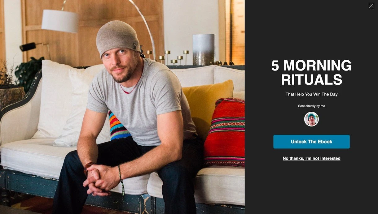 This pop-up example from Tim Ferris promotes his latest ebook. It links to a form that readers can use to sign up for the content.