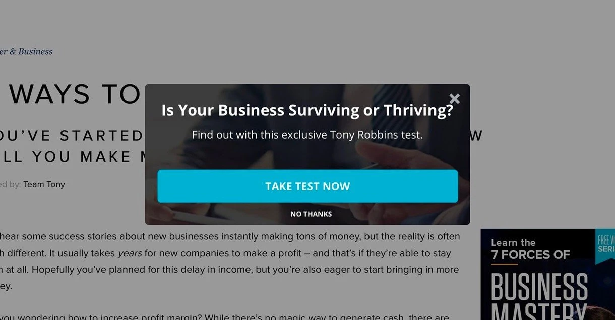 This can be an effective way to generate email subscribers as people who have spent time interacting with the test will want to know the results. The below pop-up from Tony Robbins is a good example that links to an online quiz. What business owner wouldn’t want to know if they were surviving or thriving?