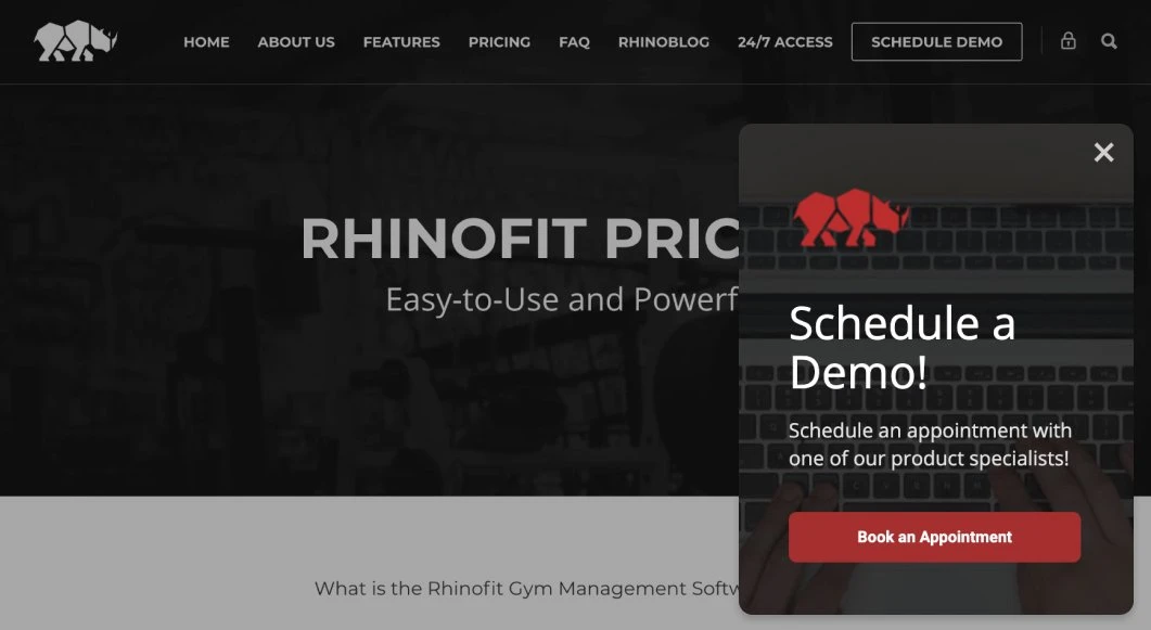 In this email pop-up example, Rhinofit uses a promotion pop-up form on its pricing page that invites site visitors to schedule a demo. This works because a meeting can help people overcome challenges they may have when buying such a high-ticket item.