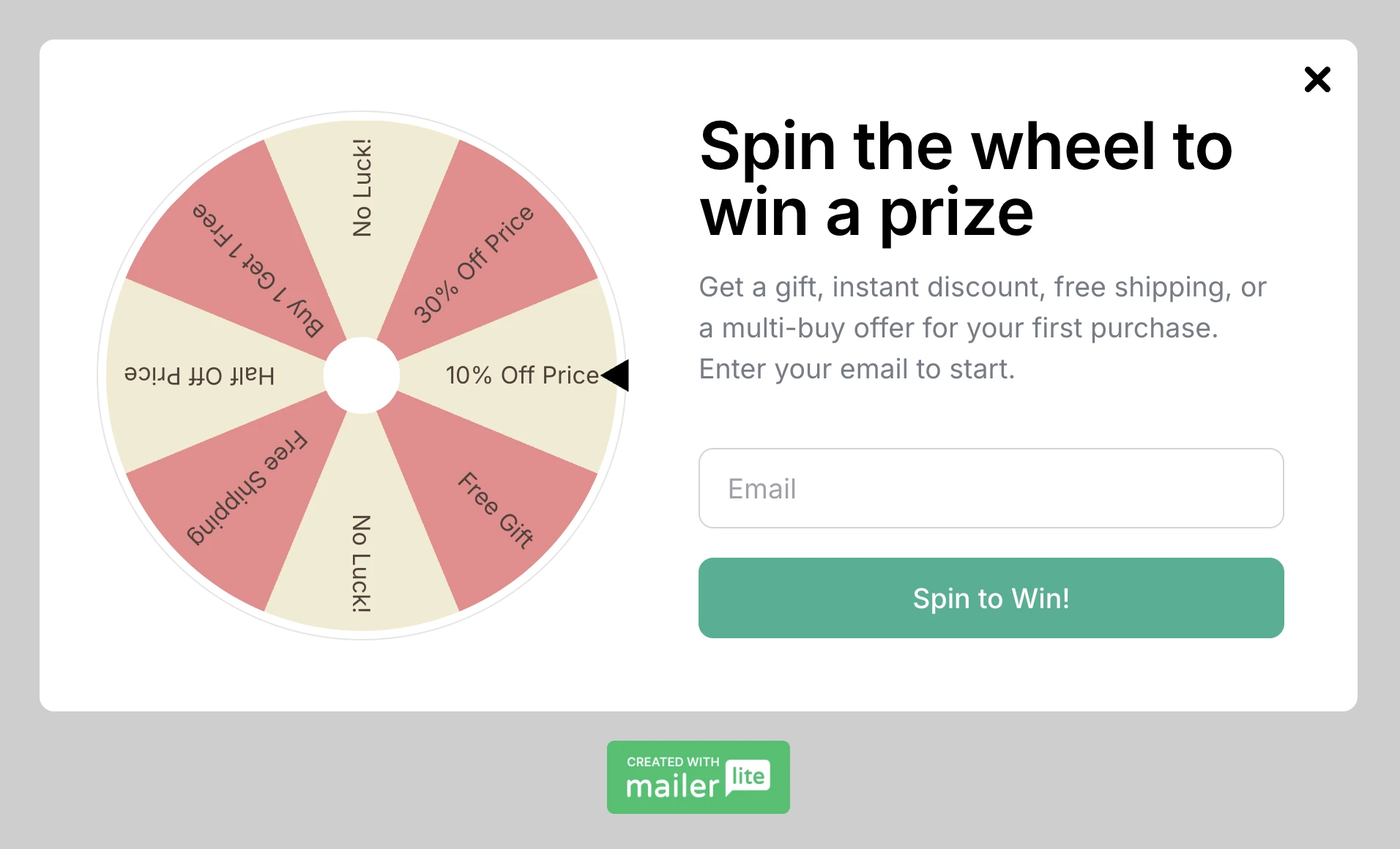 You can customize all the game settings; add up to 8 slices, give each one a percentage chance of winning, and decide whether to let people have multiple spins. After a spin, prize distribution is taken care of automatically by displaying the coupon code in the success message. You can also configure the settings to send a personalized email with the relevant coupon code to all winners.