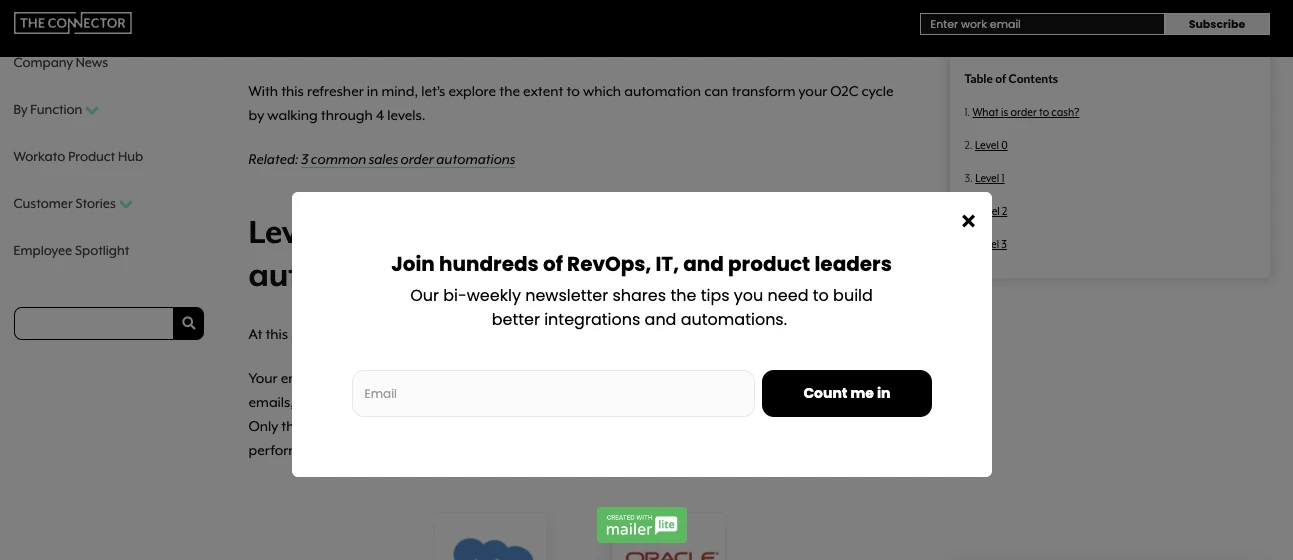 Below is an example from the integration platform Workato. The pop-up message highlights that people who subscribe to the biweekly newsletter will learn all they need to build better integrations and automation.