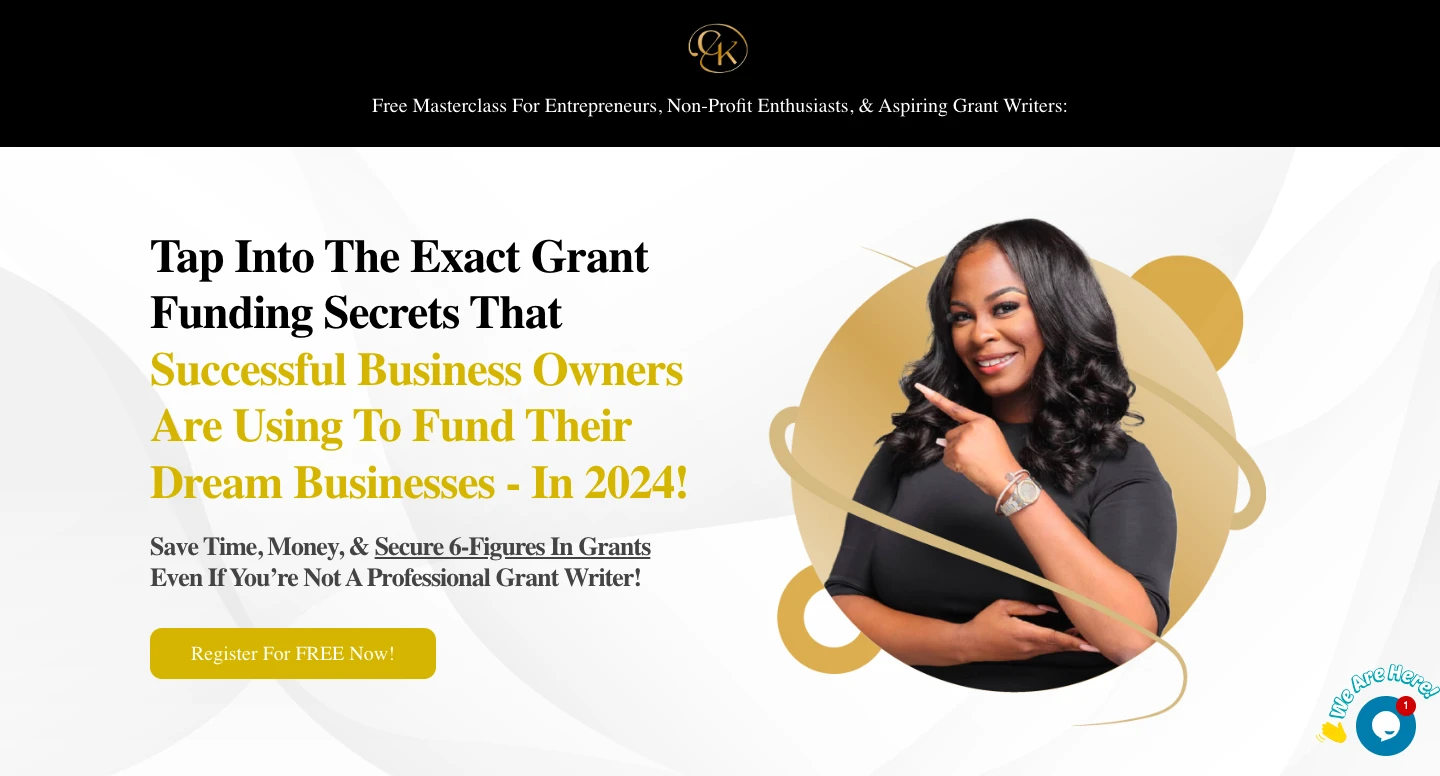 Business coach K helps people locate grant funding. Through free live trainings, she attracts new leads with this lead magnet landing page. What works well is that the page is short and clearly states what you'll learn. It closes with a bio and testimonials to build trust. With 3 CTA buttons spread over the page, it’s abundantly clear where to click to RSVP.
