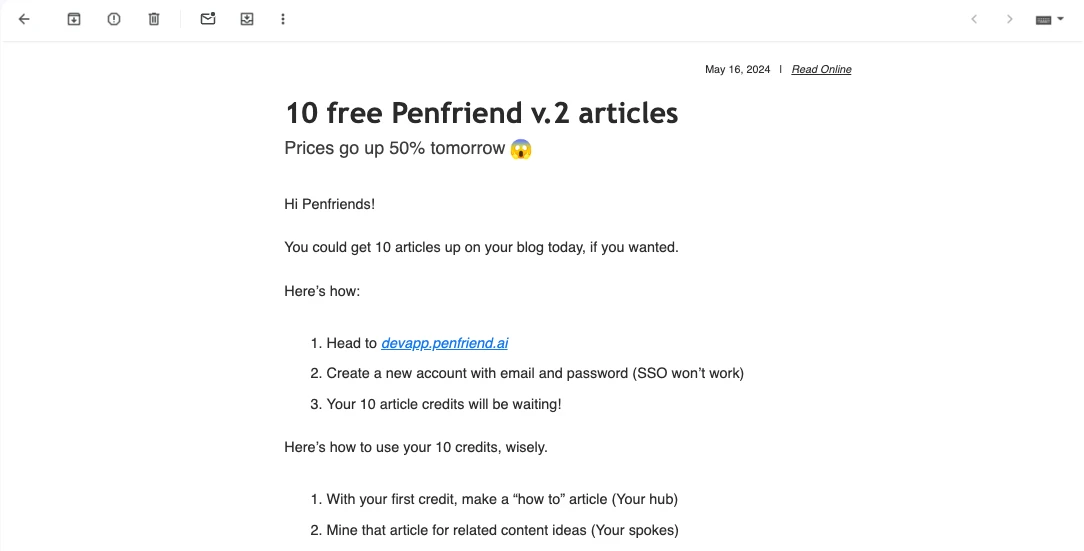 When the Penfriend team launched their product, part of their strategy was distributing content via LinkedIn and email. In one such email, marketers were invited to take their AI-driven content writer for a spin. All they had to do was create an account, and 10 free articles were waiting for them. Offer a free trial is a great way to increase signups and familiarize people with your product.