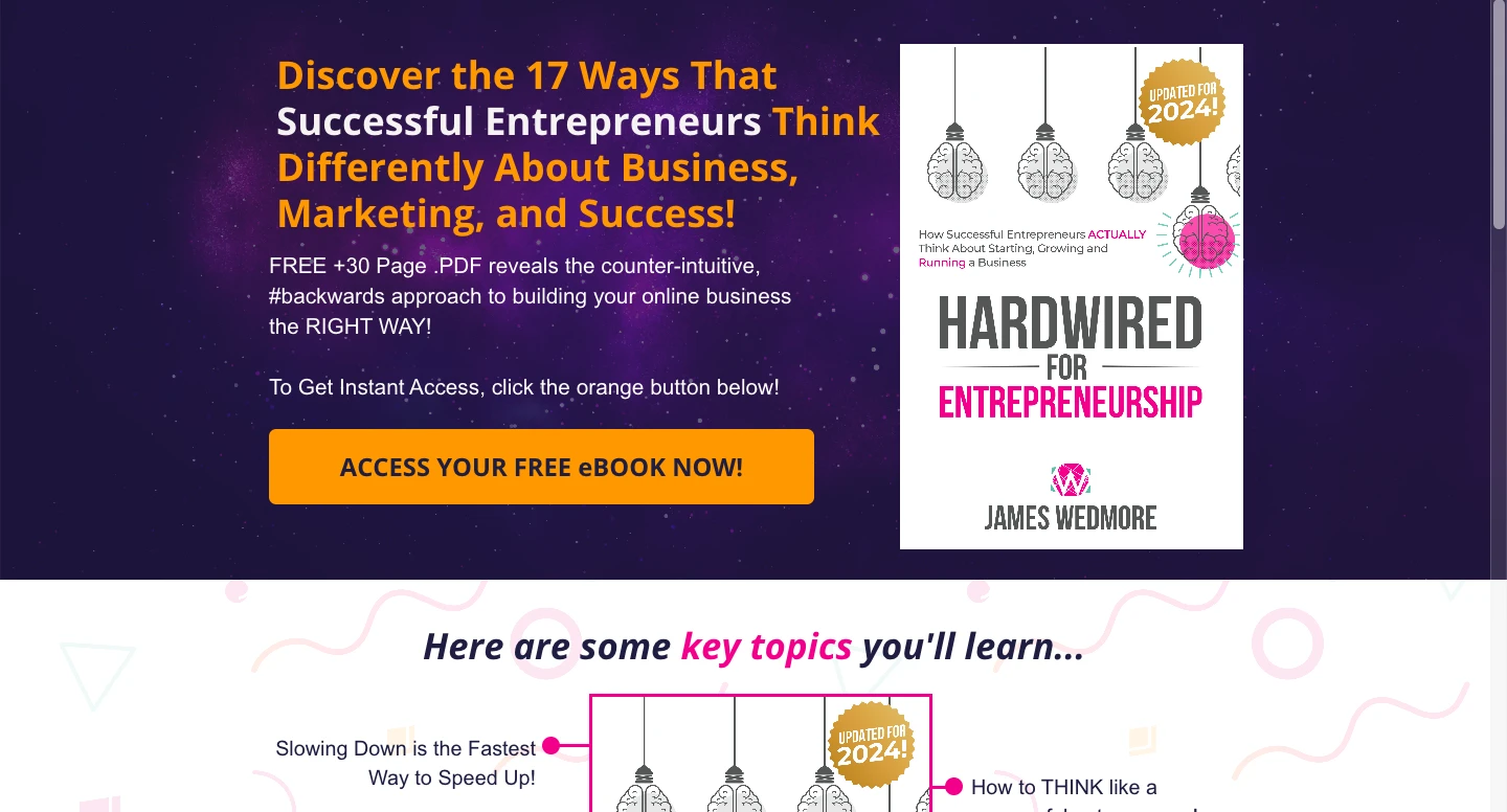The page offering James Wedmore's free eBook lead magnet contains all the key elements of a landing page that’s destined to convert. The prominent button makes it clear where to click and what you’ll get.