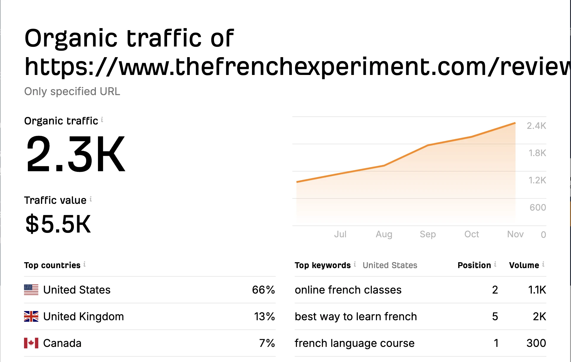 Ahrefs estimates that this blog post about the best French language courses gets around 2,300 visitors every month. This likely results in a lot of traffic and customers for the featured courses.
