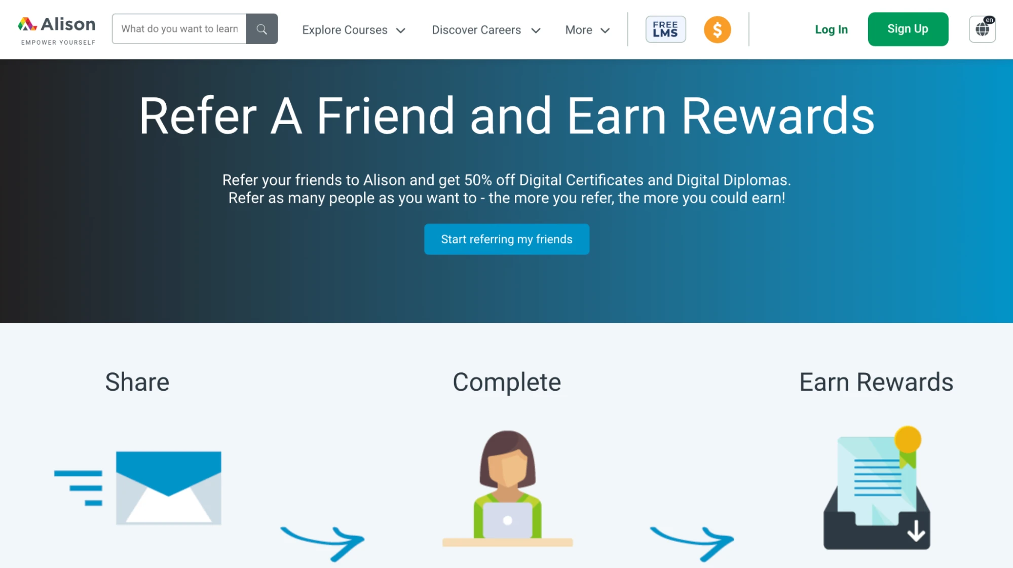 Alison’s referral program gives the person making the referral 50% off a course and the person being referred 10% off their first purchase. Since these gifts are only made when someone purchases, the business only pays out when they earn making it a very low-risk strategy.