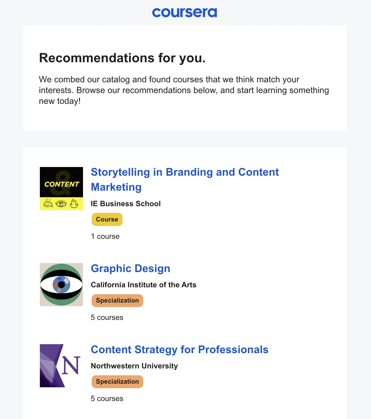 Coursera sends the below email to people who are already taking marketing-related courses. If the recipient decides to keep learning, they’ll continue paying their subscription fee, resulting in more revenue for the brand.