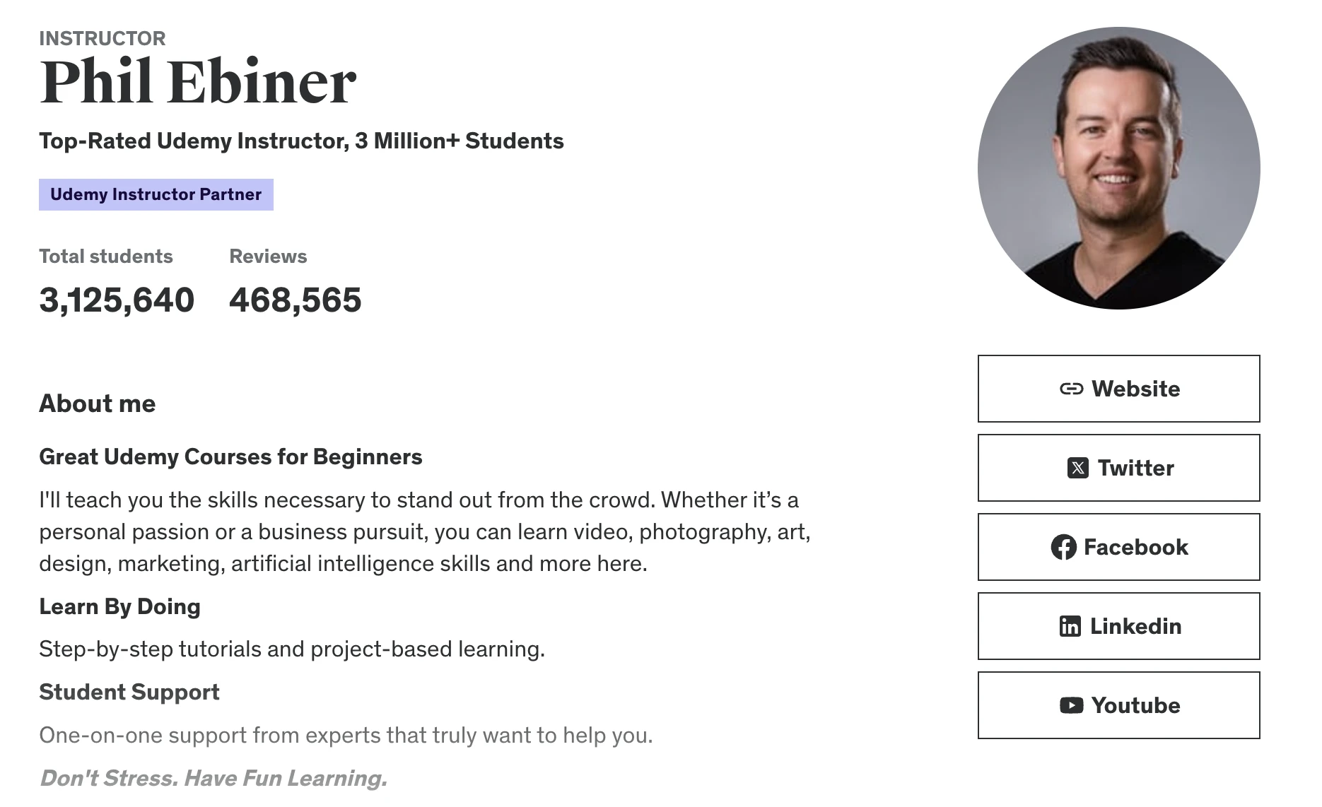 Phil Ebiner has taught over 3,125,640 students on Udemy and says he’s earned over $1 million on the platform. He has over 200 courses on the platform.