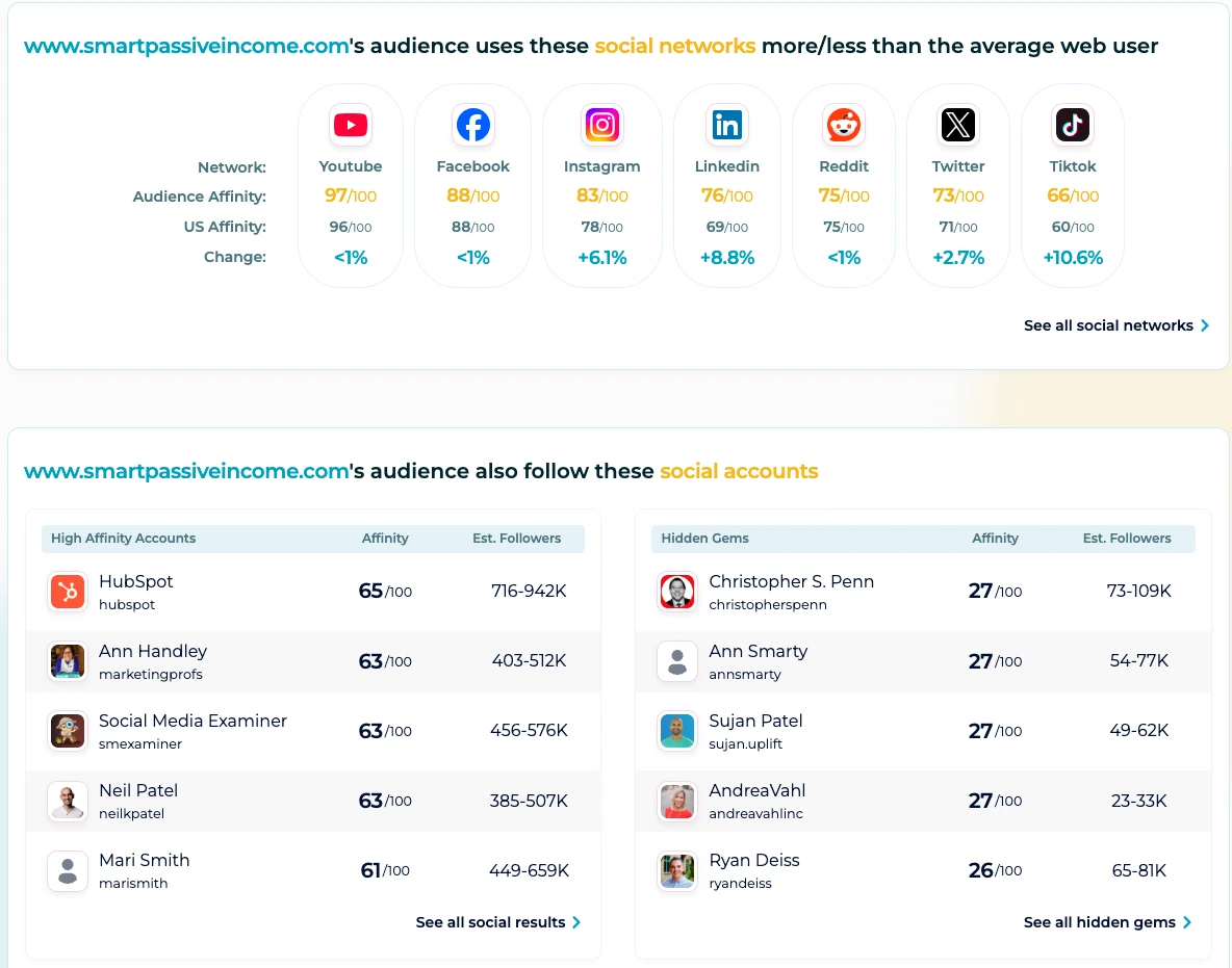 If you're unsure which platforms your target audience uses, you can use SparkToro to find out. Just choose a website your target audience is likely to visit and the tool will provide details about these people, including the social sites they use most. What's more, it's free to generate 5 audience reports a month.