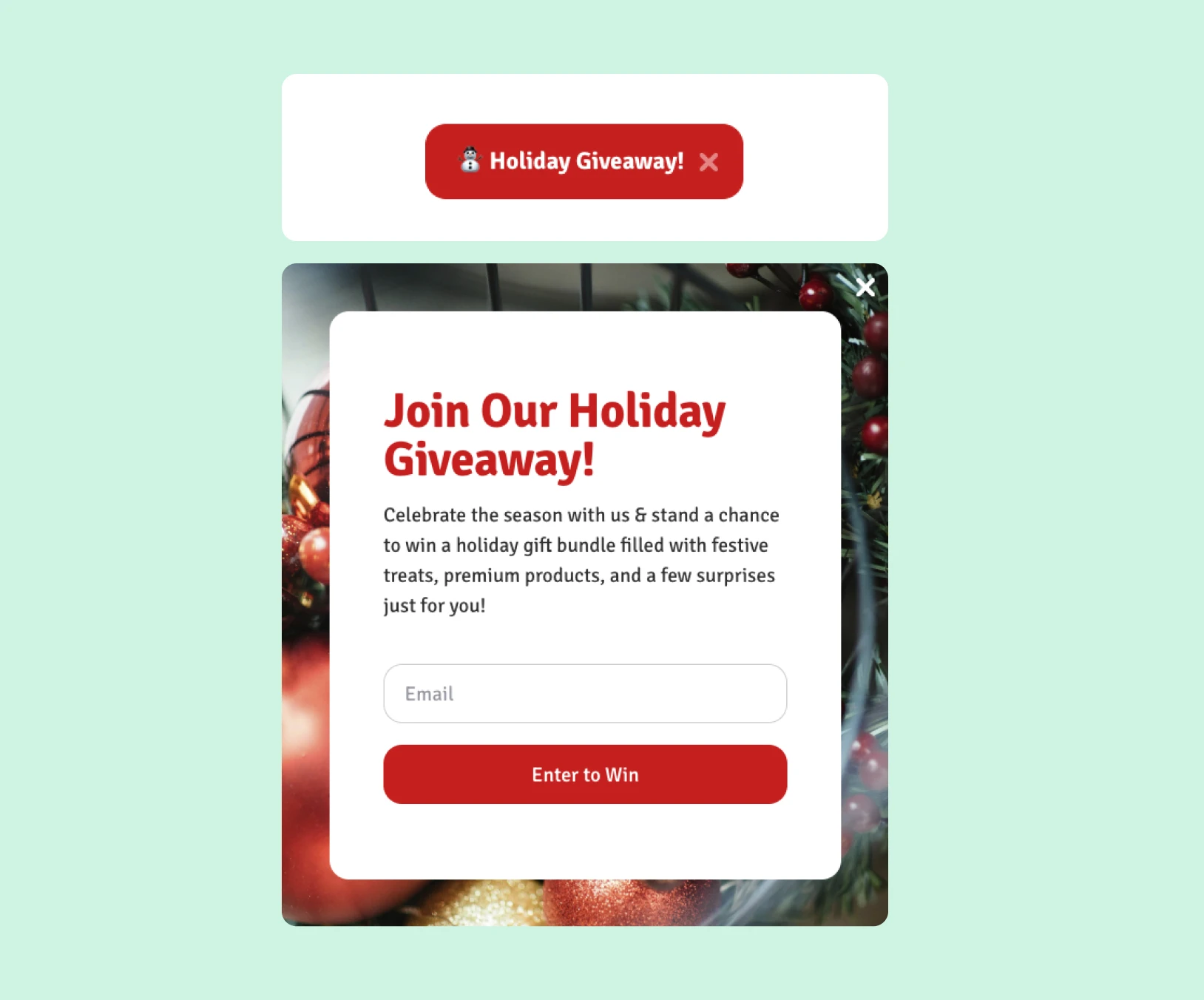 Highlight your offer without disrupting visitors' browsing with a non-intrusive teaser pop-up. When someone clicks the message, the full pop-up appears. When they close it, it goes back to the corner.