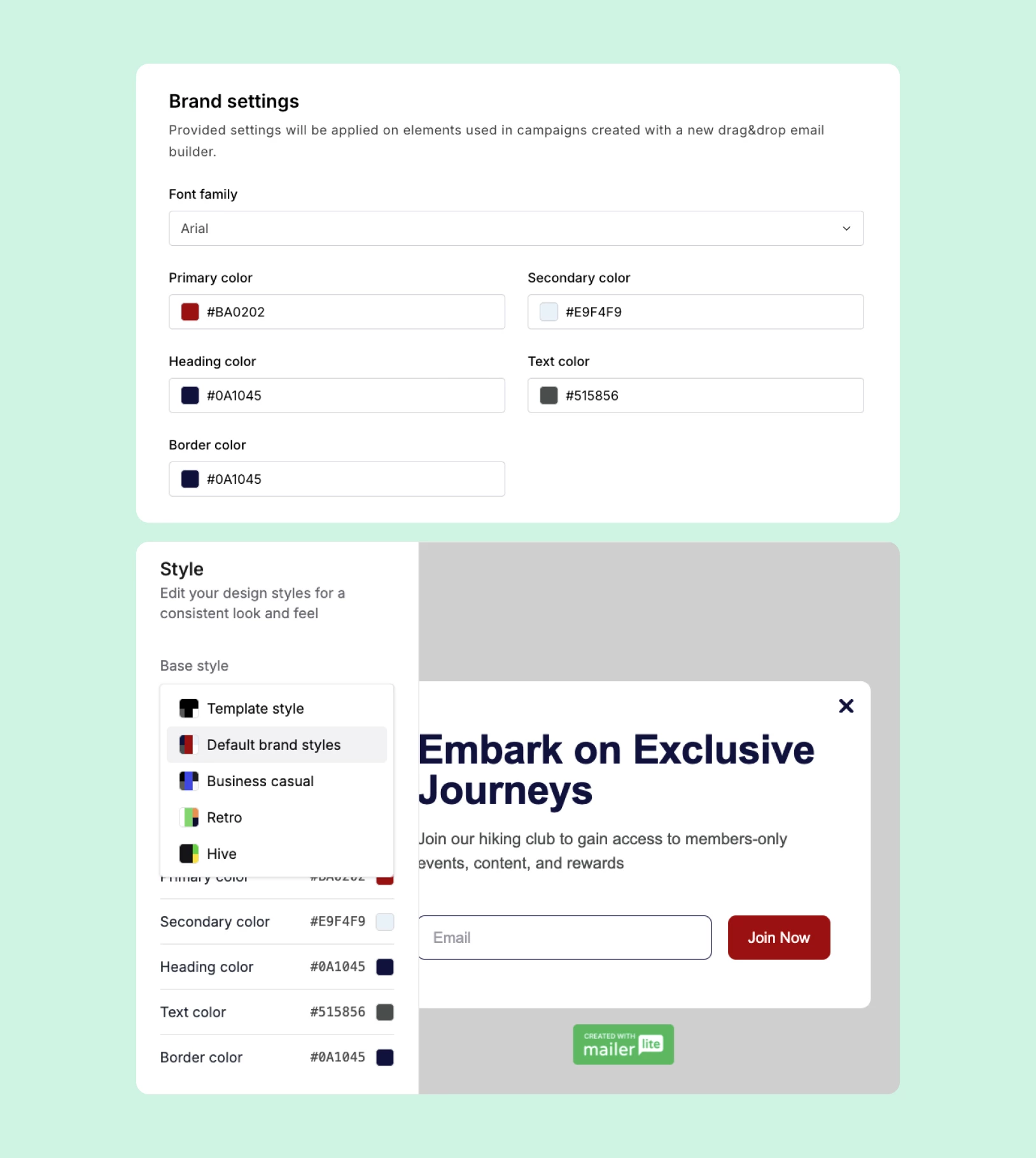 We’ve also brought a brand style feature to keep your brand looking sharp across every pop-up. Just create a brand style in your MailerLite settings then choose it from the style menu. We’ll automatically change all elements to suit your chosen settings.
