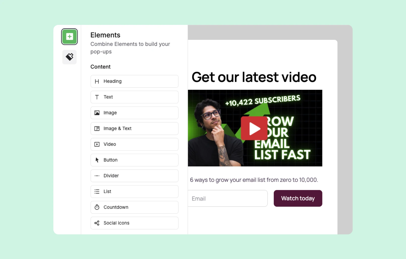 You can then add any of the 10 elements we’ve included in the builder, such as text, images, buttons, countdown timers, and a brand-new video block.