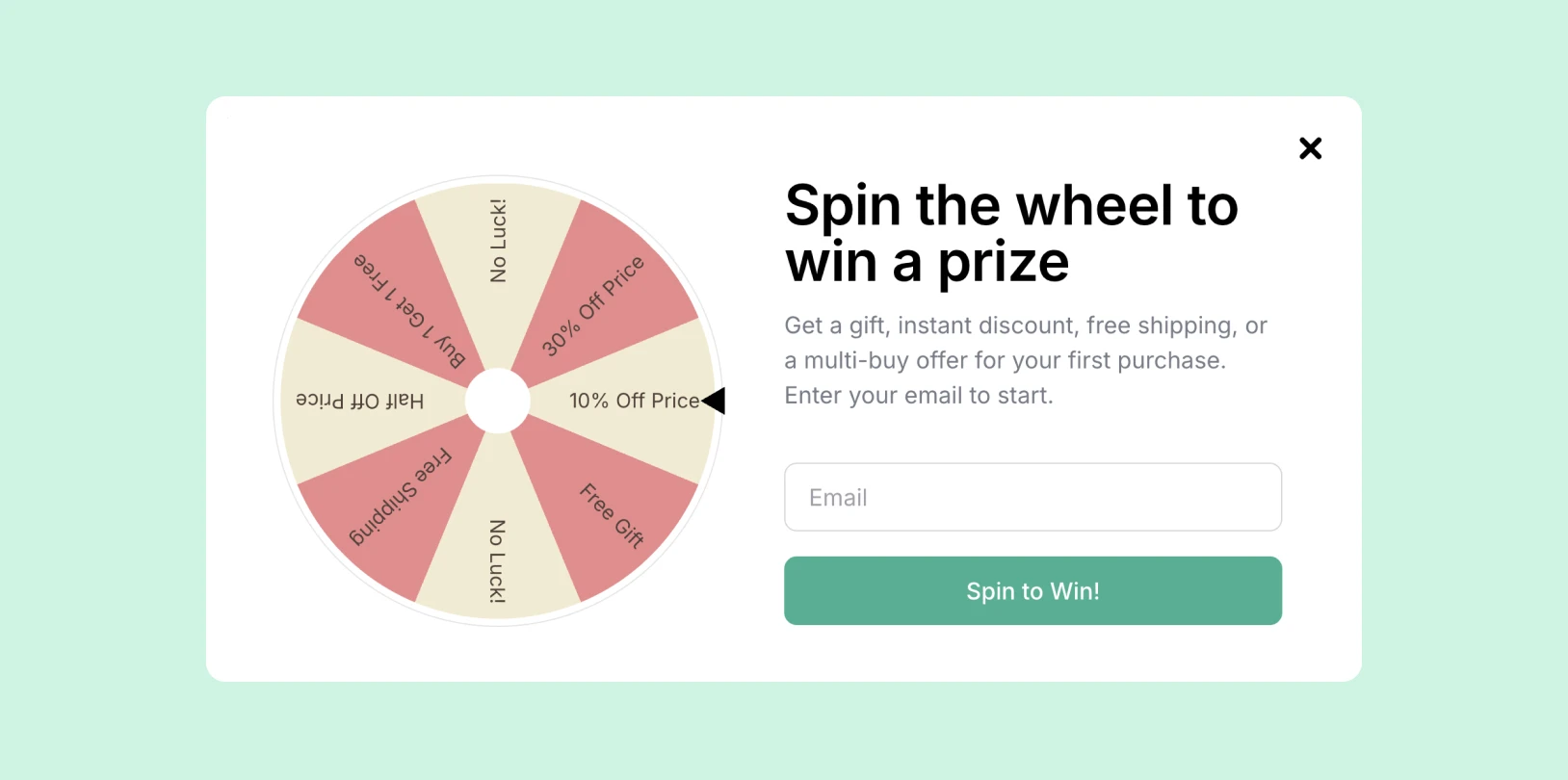 Spin-the-wheel pop-ups are most commonly used by e-commerce stores to encourage website visitors to buy a product and join their email list.