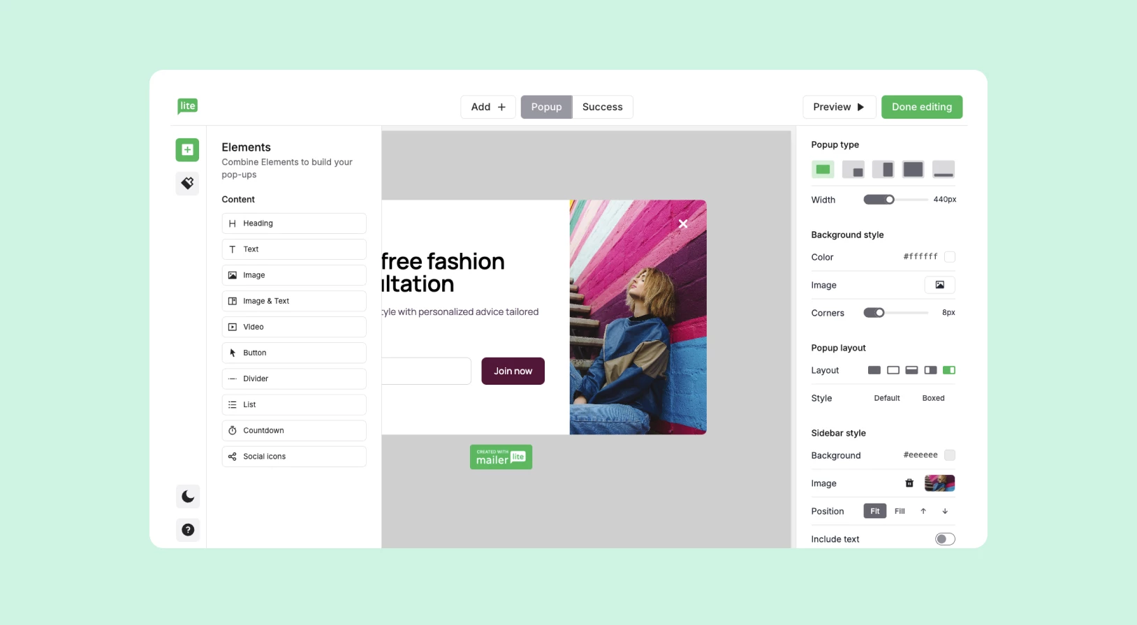 Unleash your creativity with flexible design tools that bring your ideas to life. Start by choosing a pop-up style from the lightbox, floating bar, slide-in, full-screen, or half-screen options. Then adjust the width, background, opacity, corner radius, and layout from our new always accessible settings sidebar.