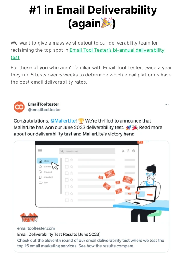 30. Share any recent media coverage about your organization, such as articles, documentaries and podcasts. When we ranked number 1 in EmailToolTester’s deliverability report, we shared the news in our newsletter.