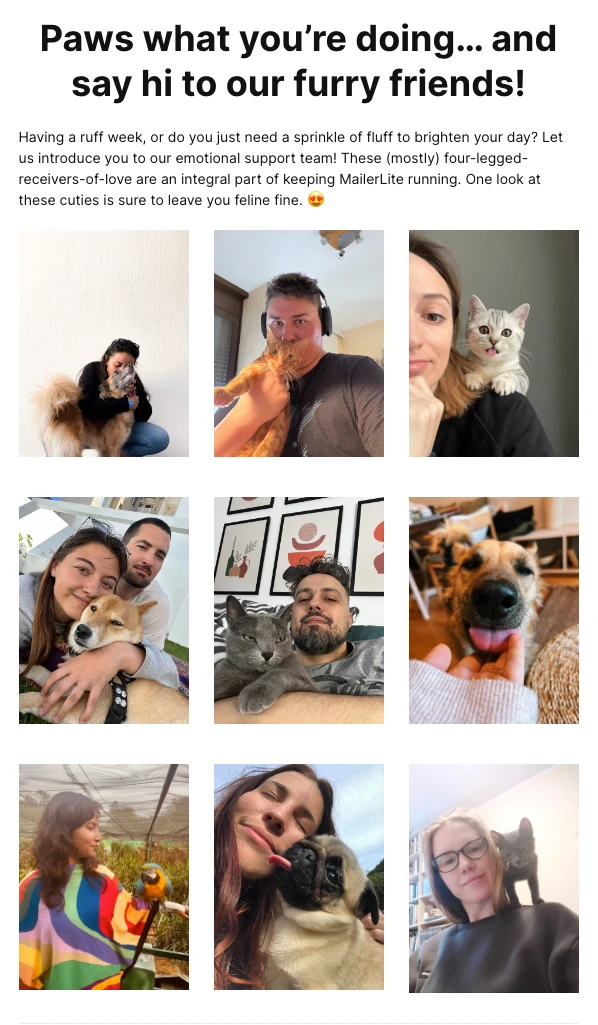 36. Share images of your employee’s pets. Everyone loves cute animal images, so share your team’s best ones, like we did in a recent newsletter.