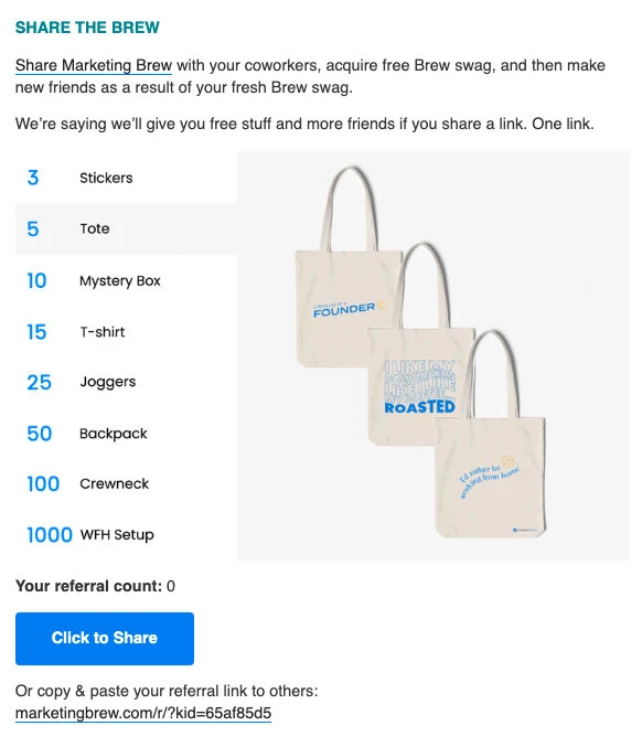 They can be extremely effective: Morning Brew’s referral program has driven around a million subscribers. 🤯 And while Morning Brew is a big brand with a custom solution, there are easy-to-use tools that make these programs available to anyone.