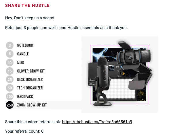 The Hustle’s referral program offers gifts for people who refer anything from 3 to 250 subscribers. The gifts are likely to appeal to the brand’s audience of professionals and entrepreneurs trying to get an edge.