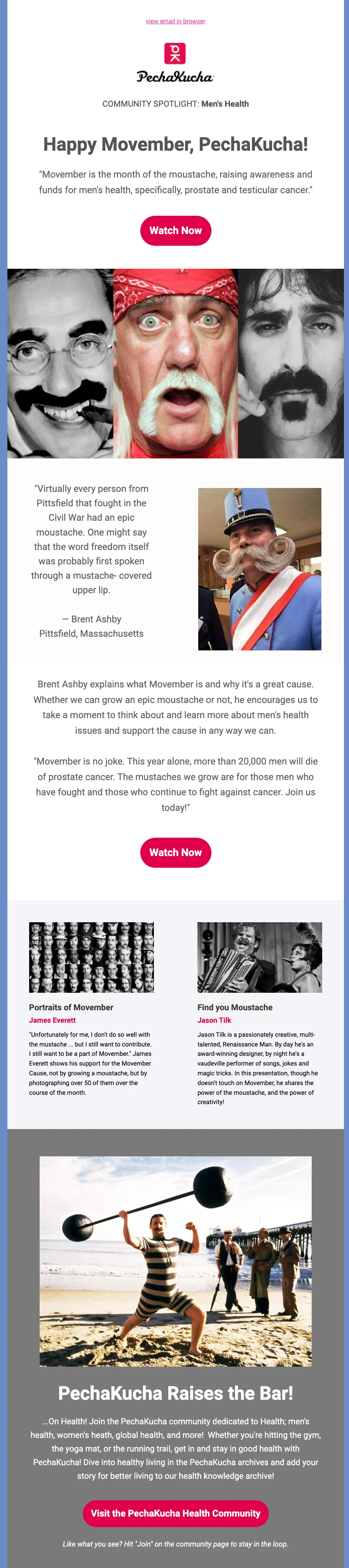 Pecha Kucha went all out for their Movember newsletter by sharing historical images of famous mustaches, a little bit about the history of Movember, and the importance of awareness around prostate cancer.